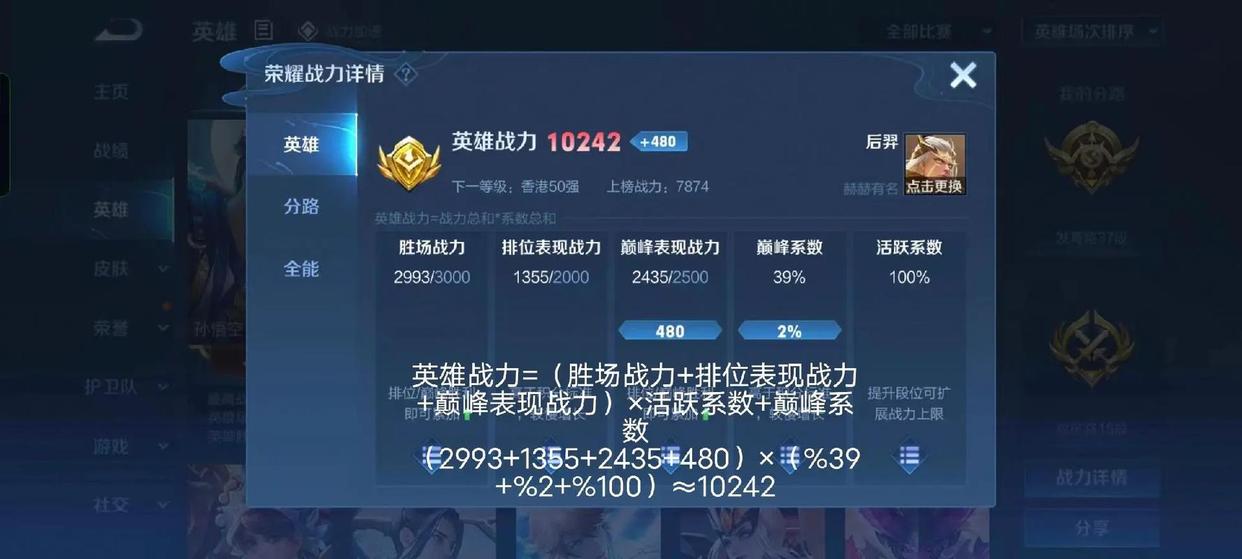 英雄战力 =(胜场战力 + 排位表现战力 + 巅峰表现战力) ×(巅峰系数 + 活跃系数)