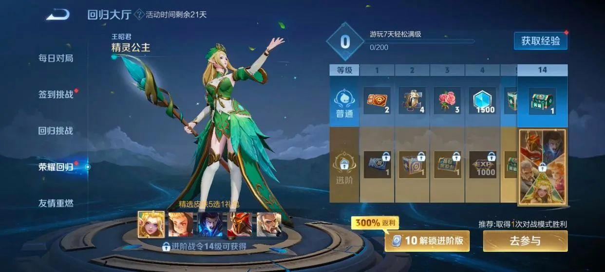 他还会有一个荣耀回归的挑战,就相当于一个战令一样的玩法,只不过它非常便宜,10点券就能进阶。