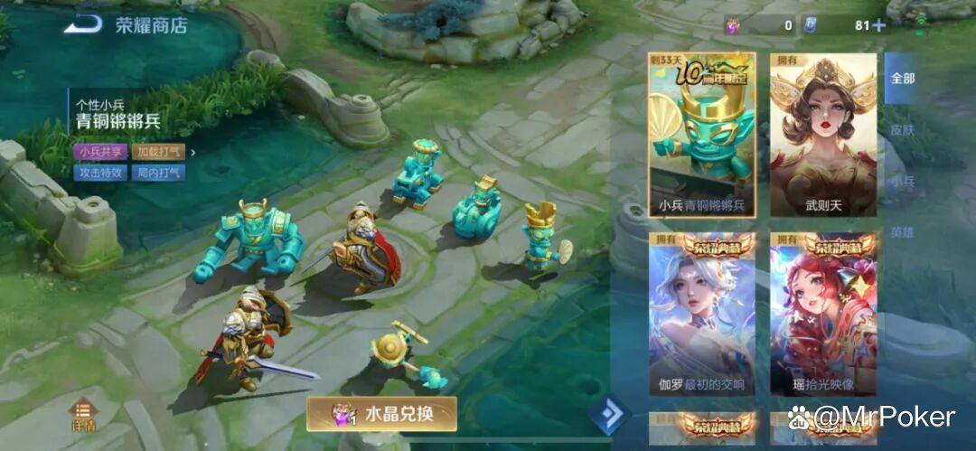 在11月27日之前,可以用1颗荣耀水晶兑换小兵的新皮肤,名字叫作“青铜锵锵兵”。