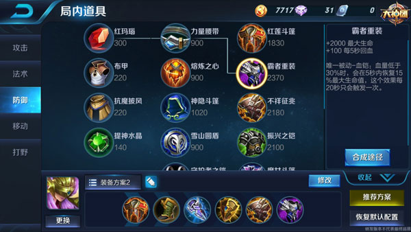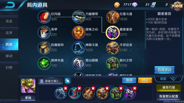 作为坦克时,第四件装备则推荐选择军团荣耀,增加自身生存能力的同时还可以提高附近友军的物理和法术防御,让队友的生存能力也得到一定的提高,让团队收益最大化。第五件装备则推荐选择不详征兆,增加增大生命和物理防御,使雅典娜生存能力进一步提高可以很好的起到吸收伤害保护后排的作用。最后一件装备则推荐选择霸者重装,增加最大生命和回复能力,让雅典娜肉到没朋友,配合上1.3技能的护盾和免控效果,让雅典娜在团战中打不死控不住,很好的起到保护后排吸收伤害创造输出环境的作用,让敌方苦不堪言。
