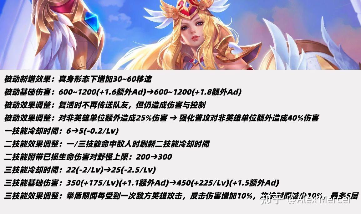 此次调整重点提升了雅典娜的输出能力和机动性,前期不需要满CD也能流畅的连招,代价就是移除了复活时传送队友,失去了掩护队友撤退的作用。