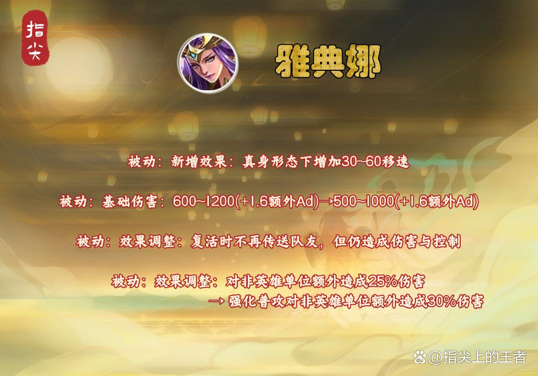 被动调整了四个方面,新增了真身形态(灵魂体)下的移速效果,让雅典娜在追人补刀的时候更轻松。