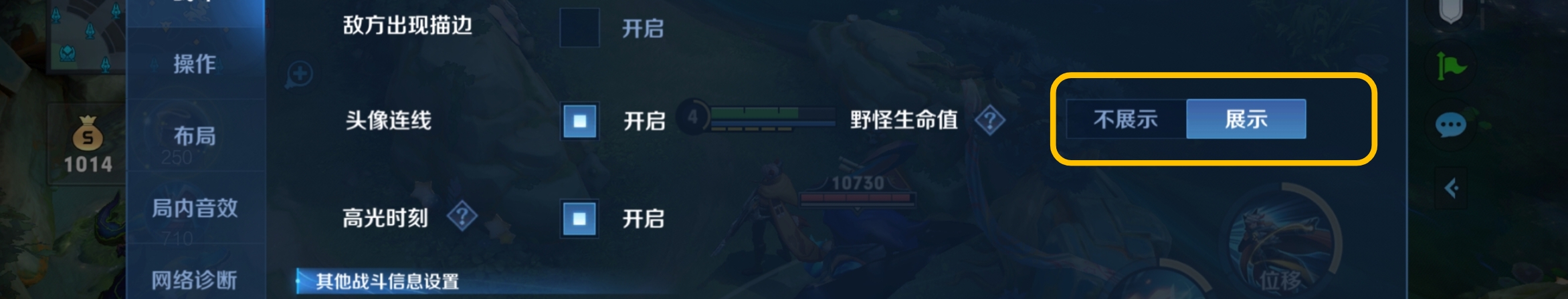 开启后,野怪血条上方将实时显示野怪具体血量,这对于打野拼惩击来说非常有用。