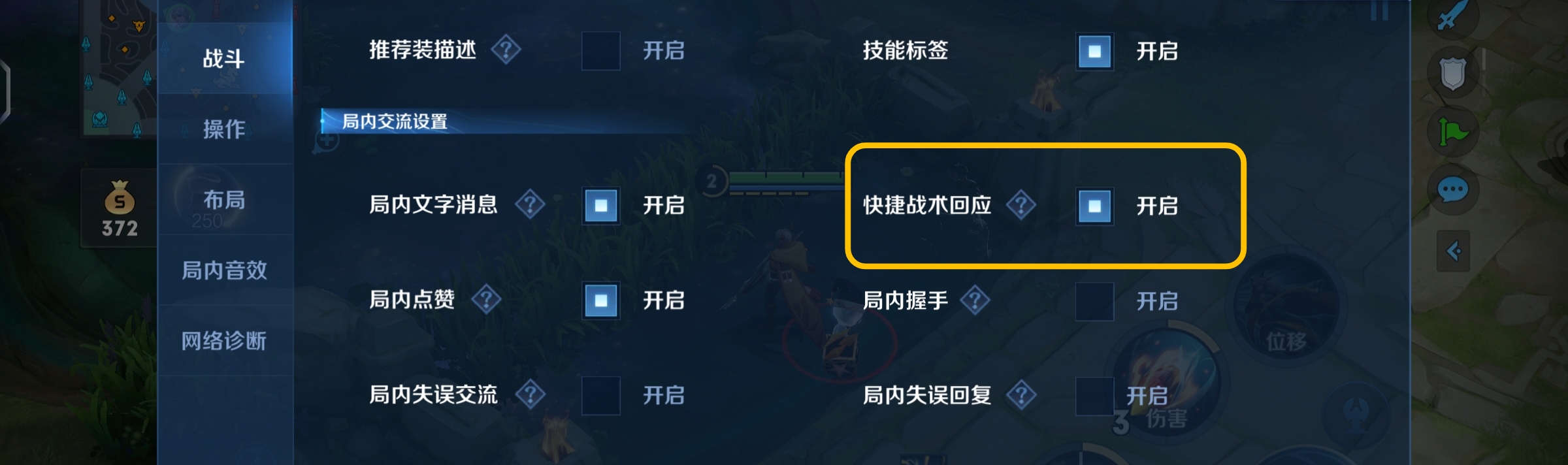 如对局中队友发出集合、保护某某时,就会自动弹出收到按键,有时就会因为这个收到按键导致自己失误,所以推荐不开启。