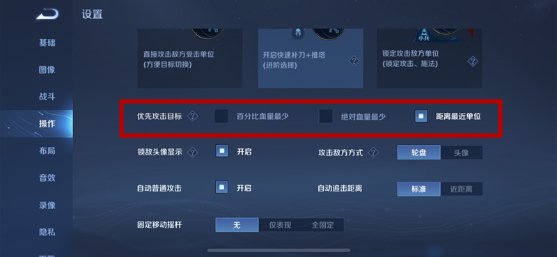 优先攻击目标大多数英雄选择绝对血量最少,部分英雄需要选择距离最近单位,如李白需要1a1a,露娜技能后接a,曹操a目标回血,老夫子平a刷新二技能,夏侯惇平a被动回复血量,梦奇平a减少一技能cd等。