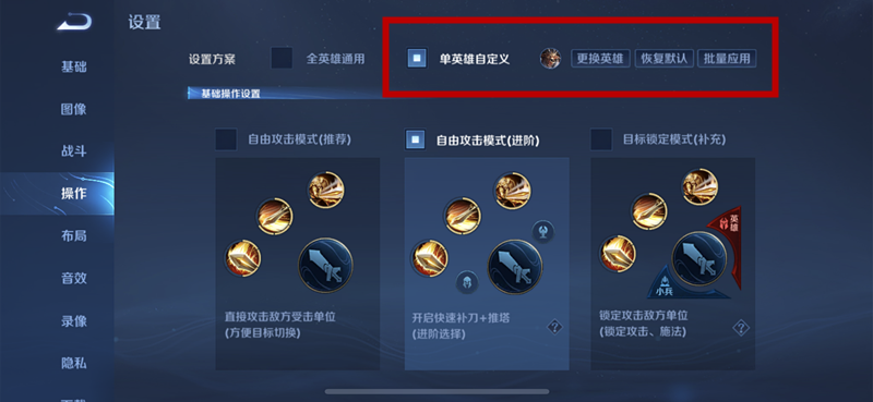这个部分设计项非常多,而且对操作非常重要。首先是点开“操作”后最上面,设置方案支持单英雄自定义,也就是说你玩每个英雄的操作界面都可以专属定制,建议根据自己常玩的英雄进行针对性设置。下面就要讲的是不同英雄该怎么调整操作界面。