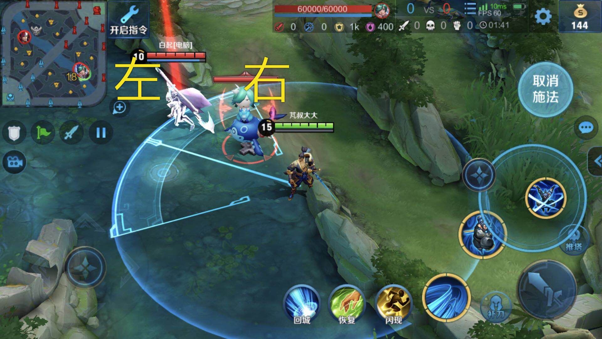 我们不免会遇到敌人离得较近,敌方后排距离较远这种情况,在这种时候我们可以这样操作。 我们通过我们的英雄所在位置观察敌方英雄在我们左面还是右面,如图白起在左,庄周在右(不管前后,只看左右)。这时候我们想选中白起的话,直接由左至右滑动红线,这样直接可以选中白起;如果想选中庄周就从右至左滑动。