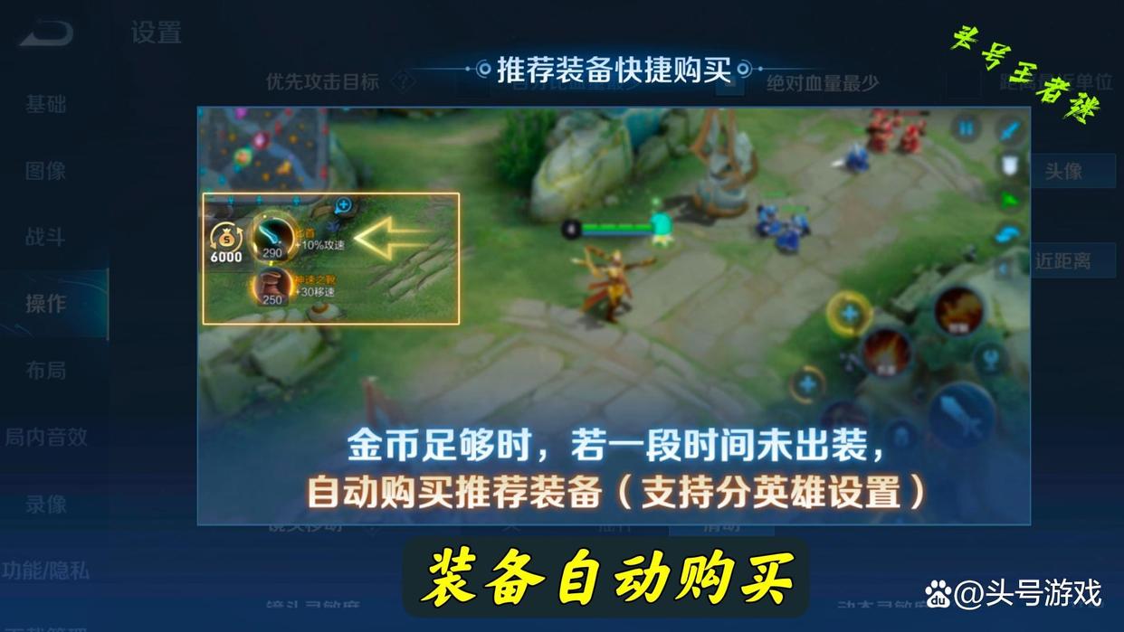 还有个实用的功能是推荐装备快捷购买,这个装备就是我们金币足够的时候,若是一段时间未购买装备,就会自动购买推荐装备,简单来说,就是我们提前给英雄设置好出装顺序,在游戏中,只要我们的金币足够,就能够给大家购买装备了,而且现在的系统优化比较好,他会优先选择小件装备,开启这个功能之后,对于那些不会出装的玩家,甚至不需要管装备,就能够自动把需要的装备给购买。