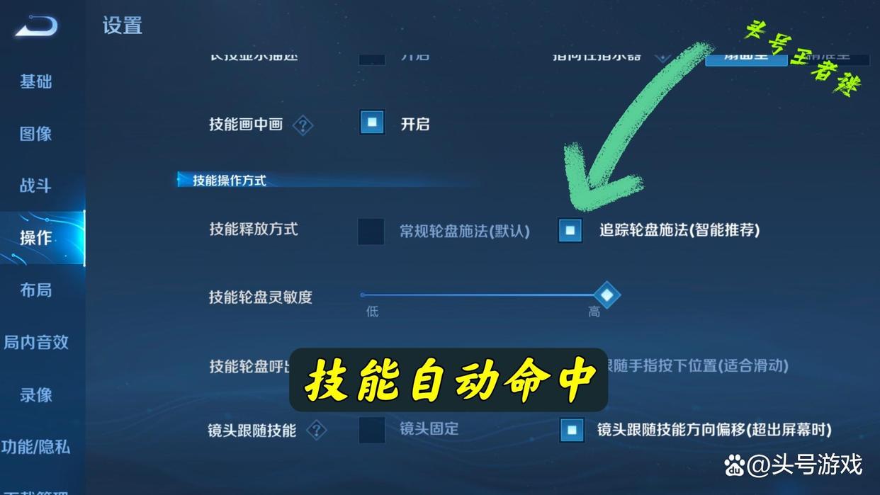 我们打开设置之后,点开操作按钮,把技能释放方式改为追踪轮盘施法,这个时候我们在释放技能的时候就会自动命中敌方英雄,当然,前提是敌方英雄在我们技能释放的范围内。而且我们在使用一些技能的时候,只需要按住不放技能指向就会自动瞄准,当我们松开手的时候,技能就会立马命中,对于那些新手玩家而言,这个功能简直可以说是妥妥的黑科技,比外挂还要强,所以建议新手玩家一定要打开。