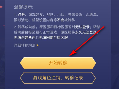 4、在角色工具页面内可以看到2个按钮分别是【开始转移】与【游戏角色注销、转移记录】,点击【开始转移】按钮,开始转移角色内所有物品。请注意这里需要保证账号内有990荣耀币。