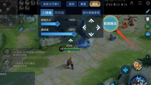 修改取消施法键位置与大小取消施法键(用于取消技能释放)可通过长按并拖动调整位置,同时通过缩放滑块修改大小。