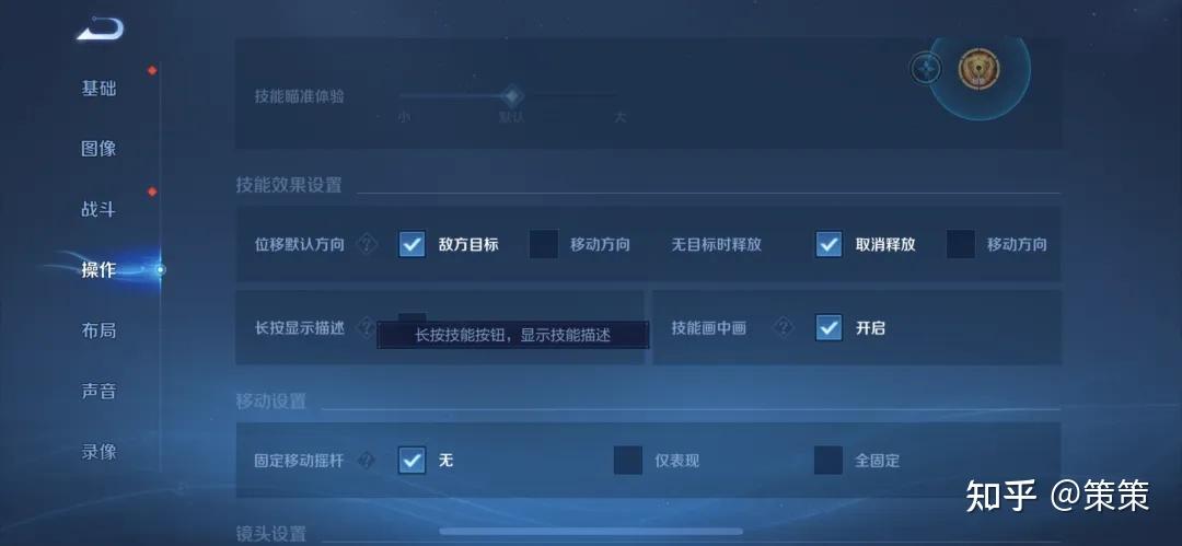 1、长按技能描述:务必要关闭,不然很容易在预判放技能时影响实战操作体验;2、移动追击:同样要关闭,就算撤退时不小心平a,也不会出现鬼畜回头的尴尬情况;3、位移碰撞提示:要打开,这样再也不用担心自己撞墙了。