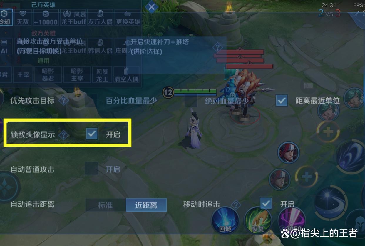 锁敌头像,可以配合技能精确锁敌,也能用普攻快速找到想要攻击的目标,但绝大多数玩家都难以在紧张的情况下第一时间点到小头像,可我依然建议开启。