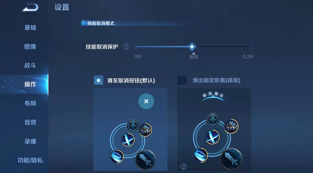 另外,经常不小心滑到取消键也是一个技能放不出的原因,许多需要拖拽释放的技能容易不小心滑到取消键导致释放不出。新赛季新增了技能取消保护,可以自行调整技能取消的生效时间。如果你总是不小心滑倒取消导致技能释放失败,可以尝试把时间调久一点。
