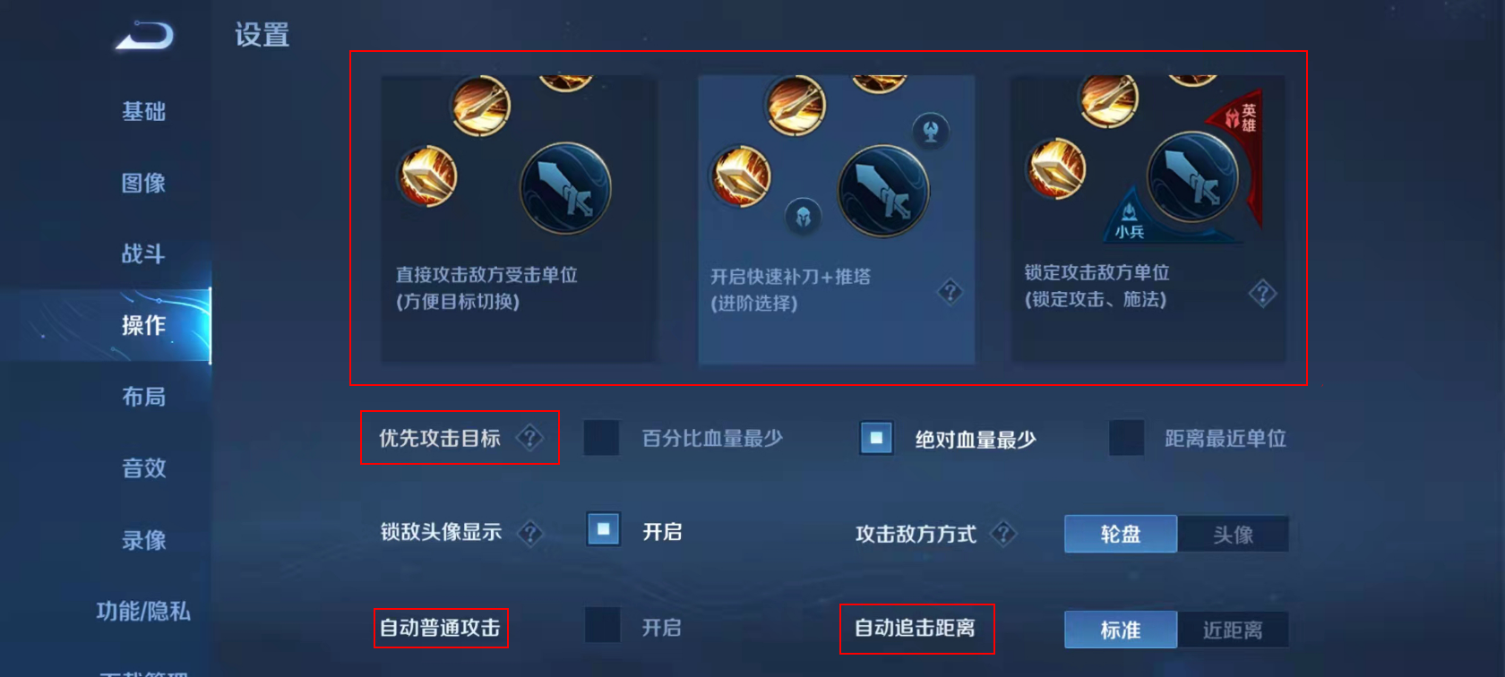 解决这个问题主要调整四个方面:攻击模式、优先攻击目标、自动追击距离、自动普通攻击。
