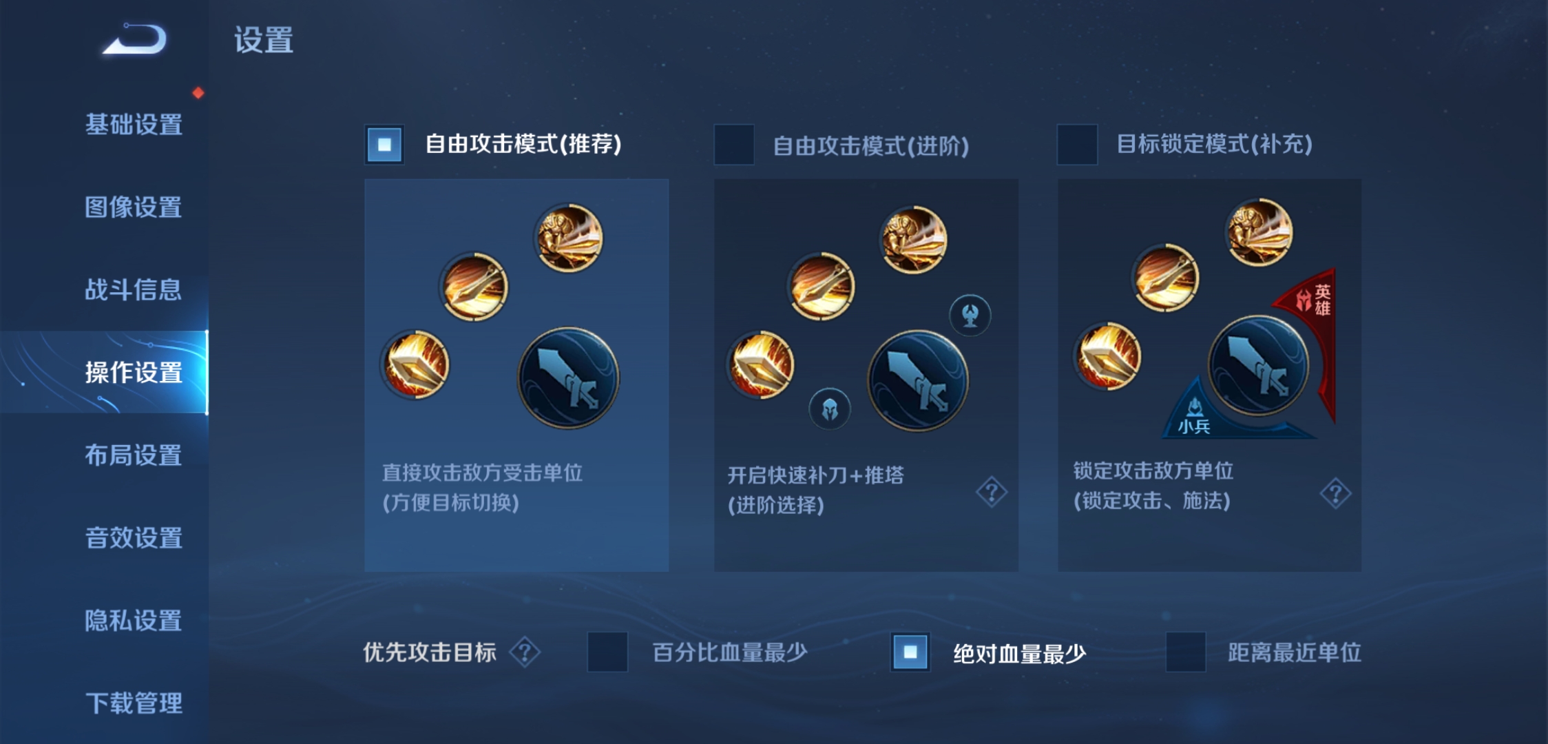 三个模式:自由攻击模式(推荐)含义是优先攻击英雄,然后是防御塔,小兵。这样的优点就是方便,只有一个键在固定的范围里怎么按都可以攻击到敌方范围的单位。自由攻击模式(进阶)含义是攻击键是主要打英雄的,底下的小兵头像主要是攻击小兵,上面的塔头像键是攻击塔的。这个模式优点是比较精准。可以在范围里直接攻击到敌人,兵线或者塔。不会出现失误特别大的操作。自由攻击模式(补充),这个模式是最精准的操作模式。就是在范围里你想攻击谁就攻击谁,但是需要你用三角键去选择你要攻击的人,只是要靠手速才能精确打击,如果手速不快就不要选择第三个模式。