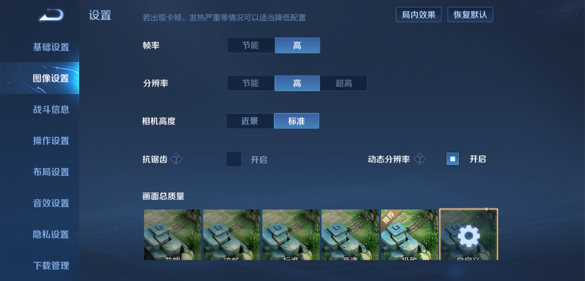 最后在附上一张页面设置,因为手机的配置差异条件好的情况下,建议把所有的配置开到高,尤其是帧率要开到最大。帧率高控制也越发的流畅。其他的图像也建议开最大。主要看自己的手机性能。