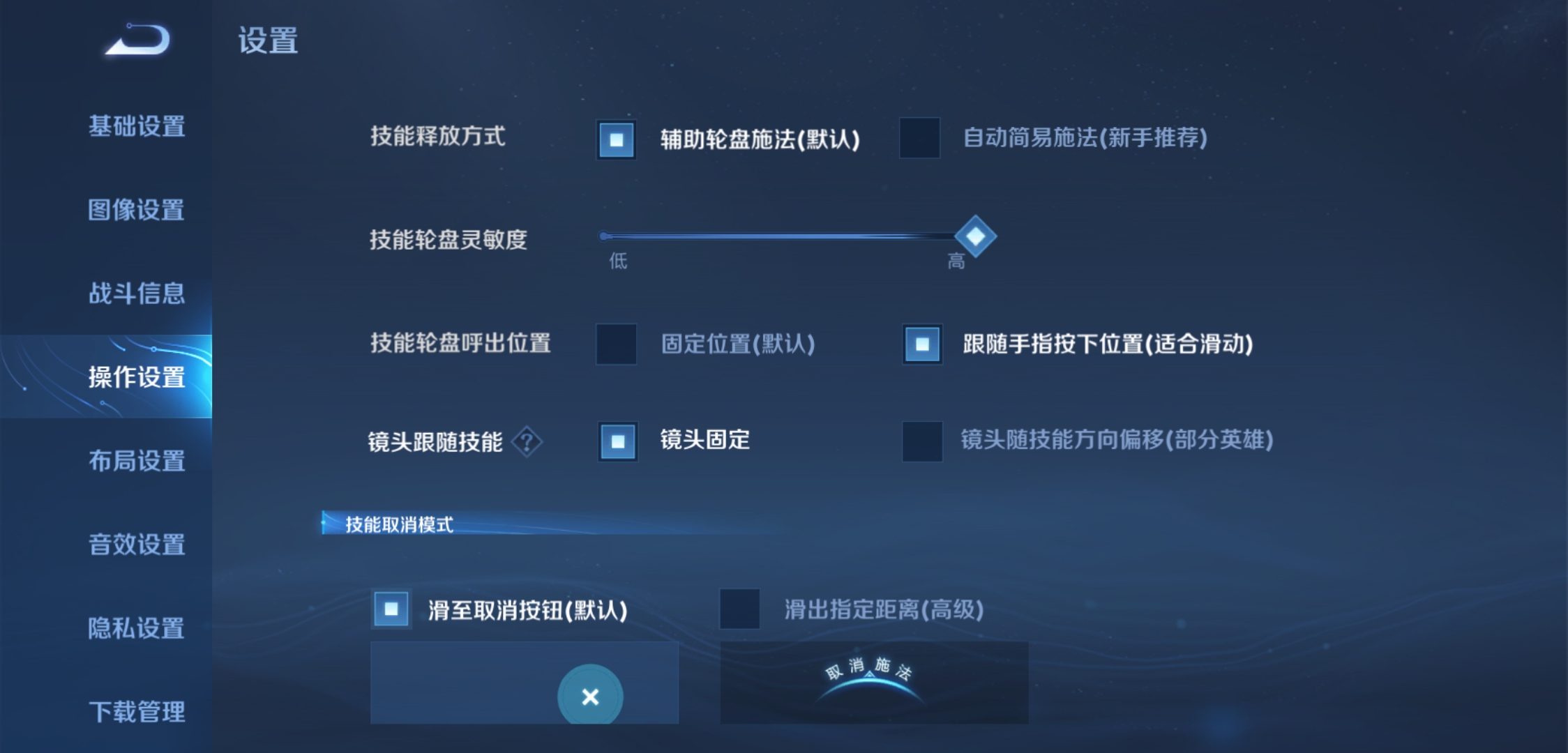 确保“技能释放方式”设置为“辅助轮盘施法”,这通常是默认设置。