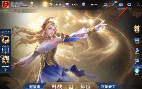进入设置页面打开王者荣耀游戏主界面,点击右上角齿轮图标(设置按钮)进入设置页面。