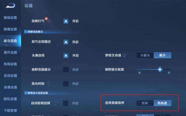 在战斗信息设置界面中,玩家可以找到“选将英雄排序”的选项。目前,游戏提供了两种排序模式:名称和熟练度。