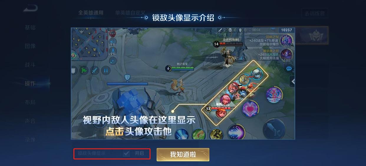①在 “操作” 设置中,还有一个 “锁敌头像显示” 选项。开启这个选项后,当 敌方英雄出现在视野范围内时,他们的头像会显示在屏幕上。
