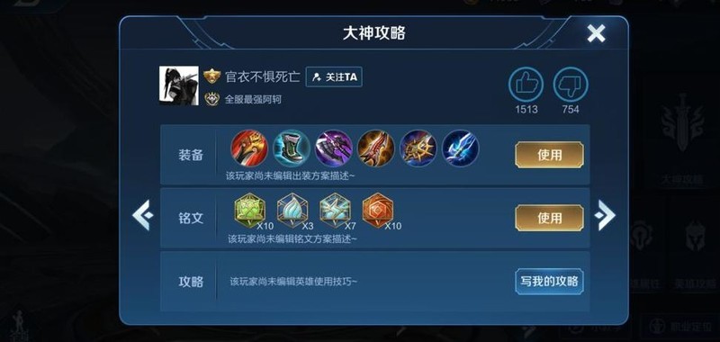 这套铭文确实真实可用,但出装明显是虚假推荐,全是保命装备,专为误导新手设计。旁边设有两个切换箭头,可查看其他真正的国服最强配置。