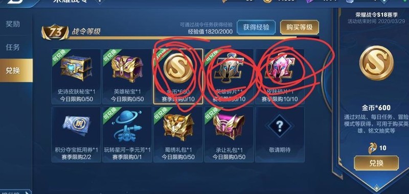 免费战令奖励相当不错,若想升级为进阶黄金版需花费388点券,约等于39元人民币。建议在皮肤确实喜欢且经济条件允许时再购买,借钱开战令并不明智。新手可使用战令币兑换图中我圈出的物品,推荐从左至右依次兑换,性价比更高。
