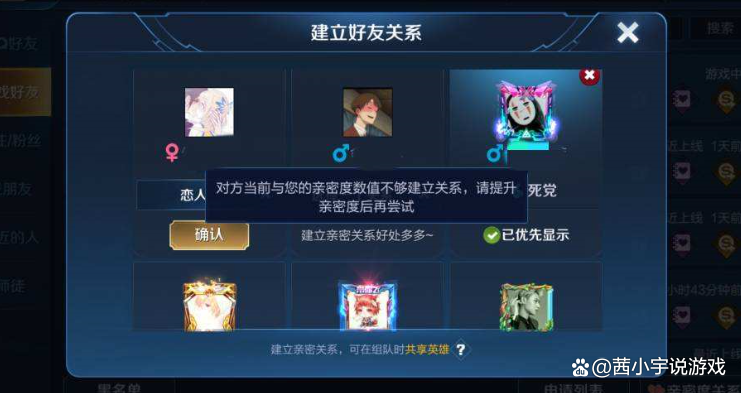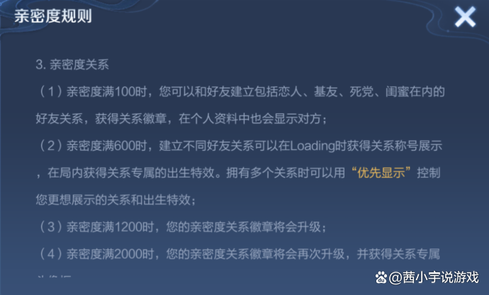 2、亲密度满600时,建立不同好友关系可以在Loading时获得关系称号展示在局内获得关系专属的出生特效。拥有多个关系时可以用“优先显示”控制玩家更想展示的关系和出生特效。