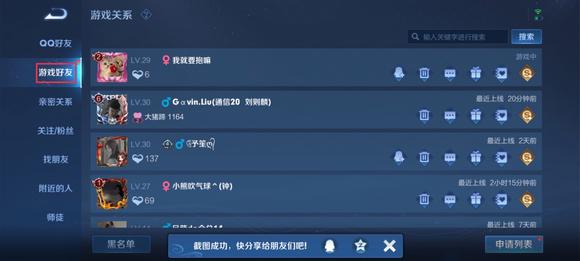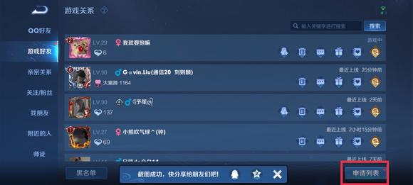 步骤二:进入好友申请列表在【游戏关系】界面中,点击左侧游戏好友选项卡,随后点击右下角的申请列表图标,进入好友申请管理页面。