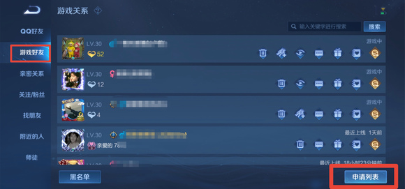 2.进入【游戏好友】界面后,点击【申请列表】。