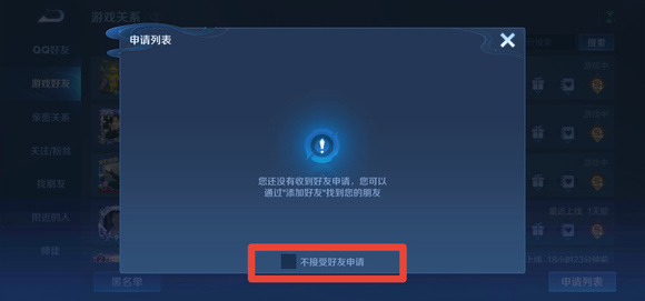 3.拒绝某个玩家的好友申请,可在【申请列表】中的申请点击【拒绝】。拒绝所有玩家的好友申请,可开启【申请列表】下方的【不接受好友申请】即可。