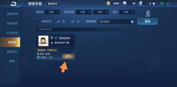 进入好友界面后点击找朋友选项,然后按照条件可以查找到其他玩家进行添加好友。