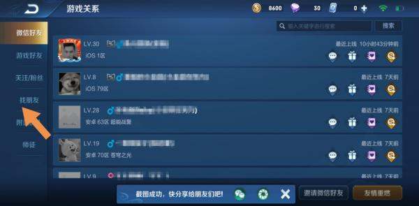 2.进入王者荣耀的好友页面后,微信好友、游戏好友、找朋友、附近人、师徒五个功能按钮将显示在本页左侧。点击游戏好友按钮