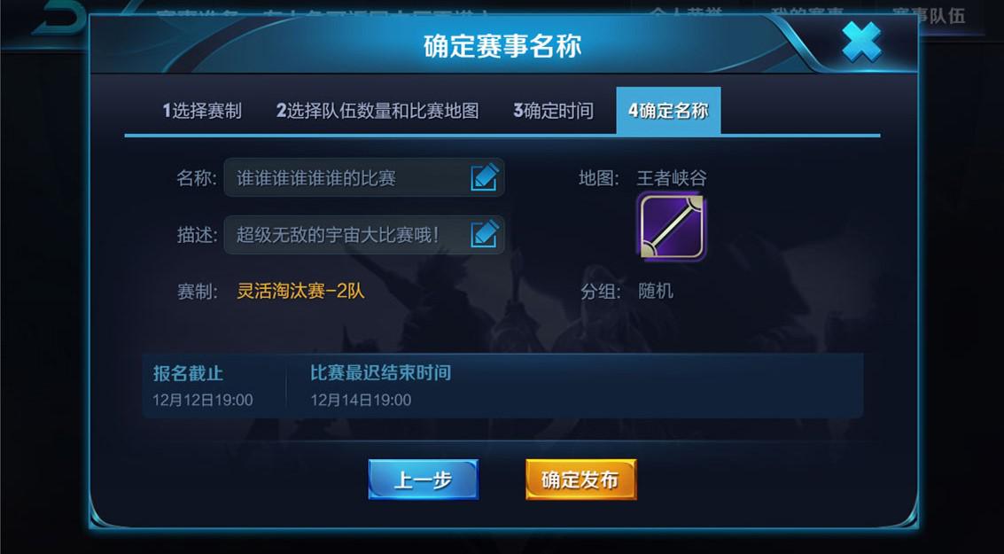 6)设置比赛名称和描述,其中名称不能为空,最终点击确认发布即完成。
