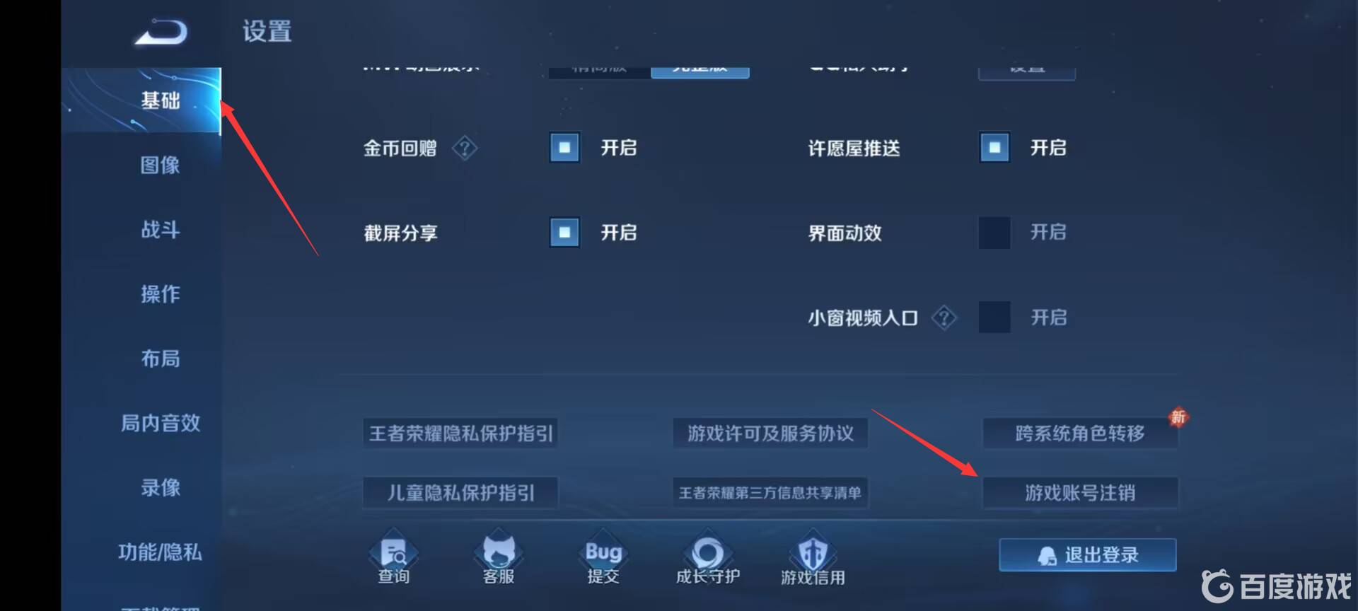 然后在王者设置页面的基础设置中的最下方有游戏账号注销的选项。