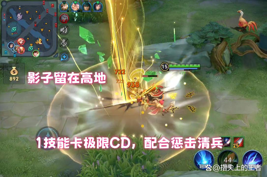 兵线到在一塔和二塔之间时,李白将1技能影子留在高地,一技能极限CD出去清兵,可以有效缓解线上的压力。