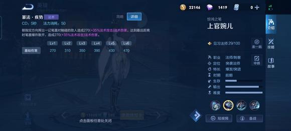 2、上官婉儿的二技能是选取远处的一个点为起点,以自己为终点又远及近,顺发伤害,并且回归轨迹也是有伤害的,利于收割,并且可以给大招飞的位置有回旋的余地,让自身落地的位置更为安全,是上官玩家秀起来的关键,所以需要主点二技能。