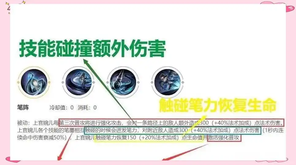 1技能 篆法・疾势:上官婉儿朝指定方向挥出力道苍劲的笔墨,笔墨飞行速度迅速减缓,对触碰敌人造成法术伤害;达到最远距离时爆炸,对附近敌人造成法术伤害。