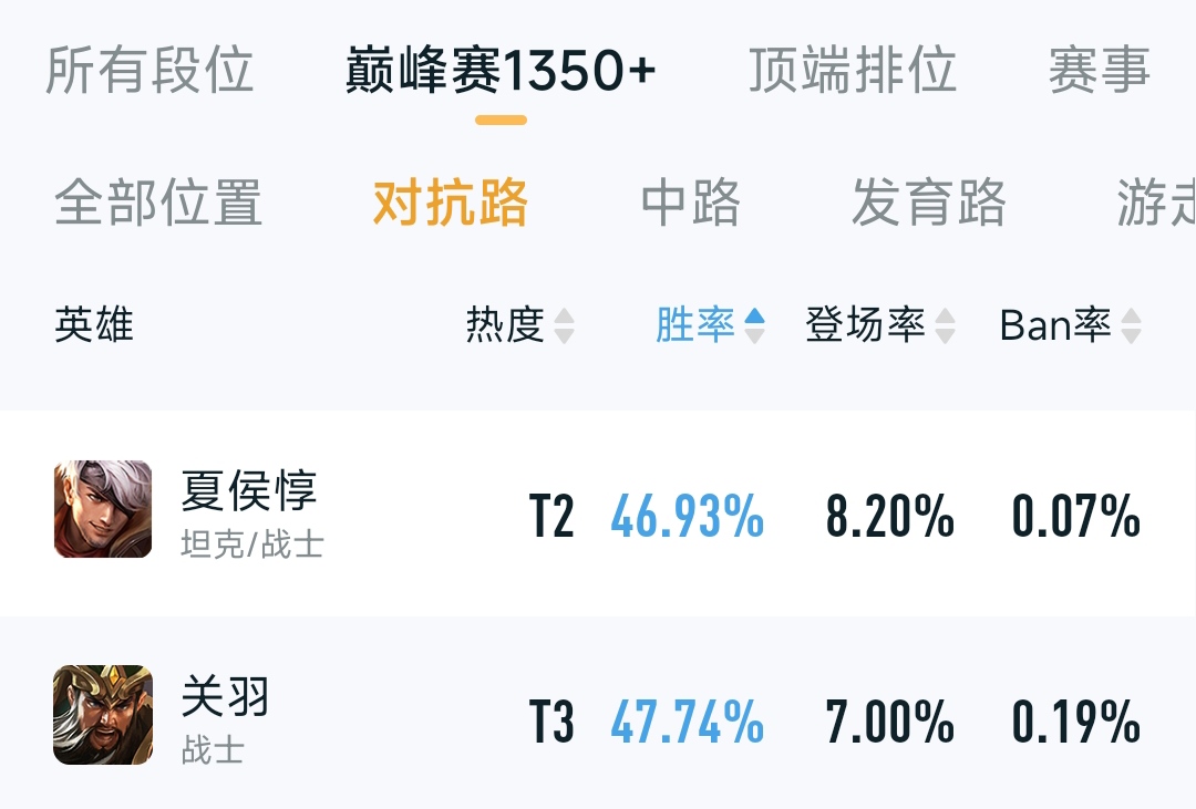 你没有看错,夏侯惇高端局的胜率跌破47%。在对抗路的胜率上面排名倒数第一。出场率也有些提升,来到8%。夏侯惇真的弱吗?