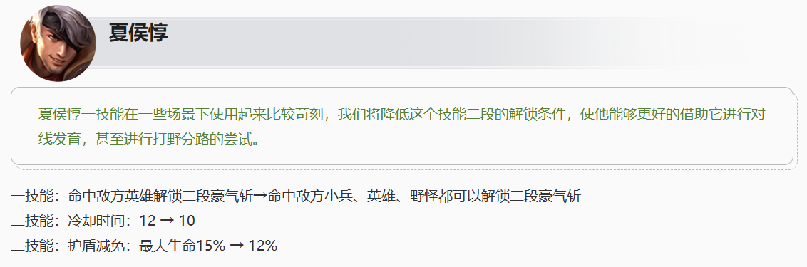 胜率是不会骗人的。夏侯惇在边路真的就是略感尴尬,一个属性全面的坦克,几乎没有任何缺点,甚至这次调整,让夏侯惇一技能可以通过兵线、野怪解锁二段,护盾的cd减少。这样一个调整没有让夏侯惇稳定提高胜率,原因是多样性的。