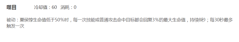 被动——噬目!这个技能是决定夏侯惇为何是强势英雄前期强势英雄的决定因素。有两个作用回血与提高对线生存力。在实战中,你发现夏侯惇残血时,一定不要以为可直接硬刚!当你的级别与输出不够时,一定不要挑残血夏侯惇。
