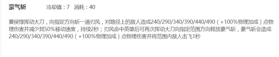 一技能——豪气斩!这个技能是夏侯惇的控制技能。减速与击飞,往往是团战中的必杀技!一旦一技能出手,就是输出C位建功之际。
