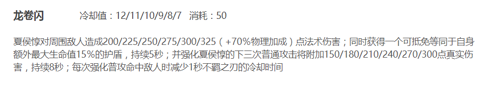 二技能——龙卷闪!这个技能关键是提高坦度与伤害。其中的护盾与真实伤害,往往是夏侯惇对线时的生存保障。也是团战中力挫敌方的重要技能。