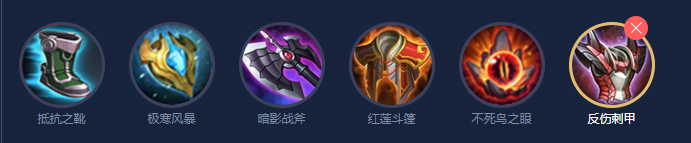 出装推荐:抵抗之靴、极寒风暴、暗影战斧、红莲斗篷、不死鸟之眼、反伤刺甲