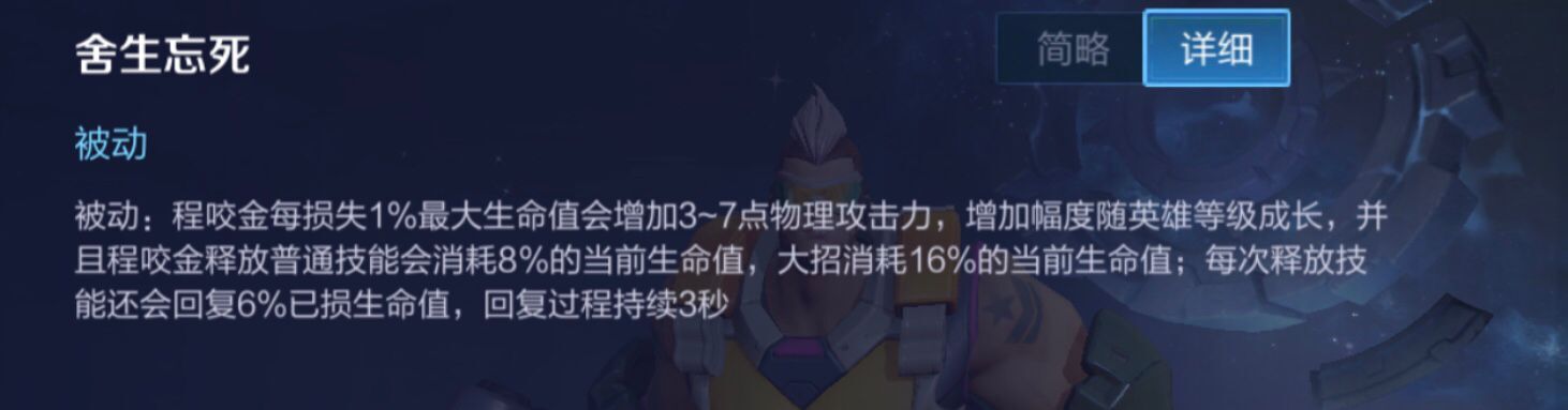 程咬金每损失1%的最大生命值就会增加自身的物理攻击,而在使用普通技能的时候是会消耗当前8%的最大生命值,大招则是会先消耗16%的当前生命值,然后才开始回复血量,并且每次释放技能还会额外回复6%已损失的生命值。