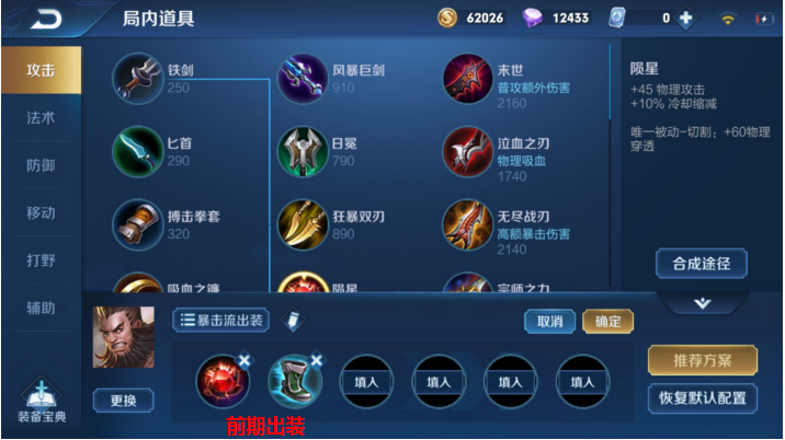 程咬金的主要伤害是平A跟二技能,既然是暴击流出装第一件先预购的是陨星而并非是购买鞋子出门,让他前期既有穿透又有物理攻击和10%的冷却缩减,之后出抵抗之靴提升韧性减少被控制的时间,非常适合暴击流程咬金打出前期的优势。