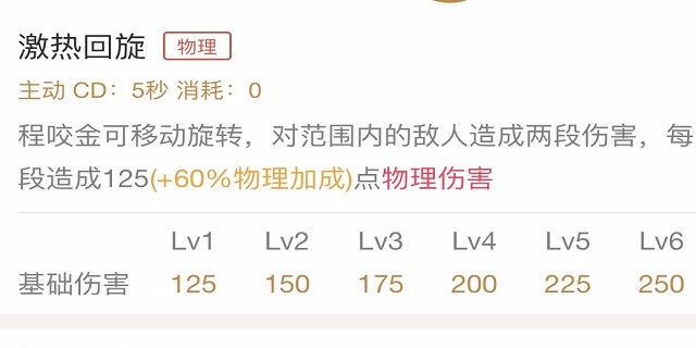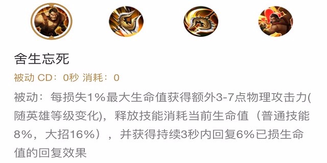 程咬金在血量越低的情况下攻击力越高,且随着等级提升,并且使用技能后会瞬间减少当前一定百分比血量,并在数秒内回复一定血量。这个技能可以为程咬金提供大幅度攻击力加成,意味着肉装的程咬金也能拥有很强的输出能力。