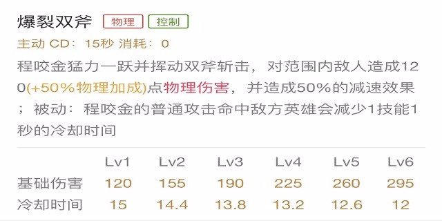 程咬金转动双斧,对范围内敌人造成一定伤害。该技能是程咬金最主要输出技能,伤害不俗,冷却时长较短,并且可以在移动中释放该技能,因此让程咬金的输出方式更加灵活。