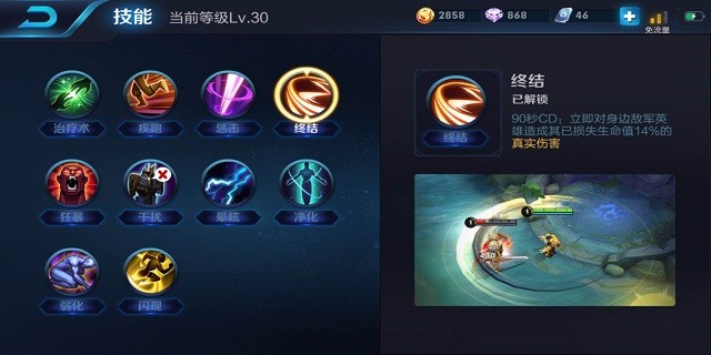 作为一名持续输出型坦克英雄, 程咬金缺乏瞬间打出高额伤害的能力,因此终结可以很好地弥补这一不足,在敌人血量见底的时候瞬间带走对方。