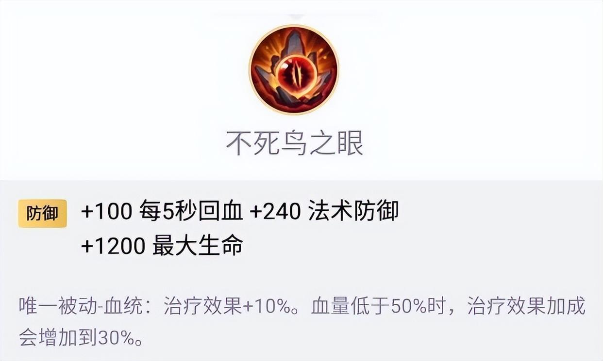 很多人不知道,程咬金大招回血受最大生命值加成,而不死鸟之眼的被动血统——血量越低治疗效果越高(最高30%),正好和大招形成"血越少回越快"的良性循环。